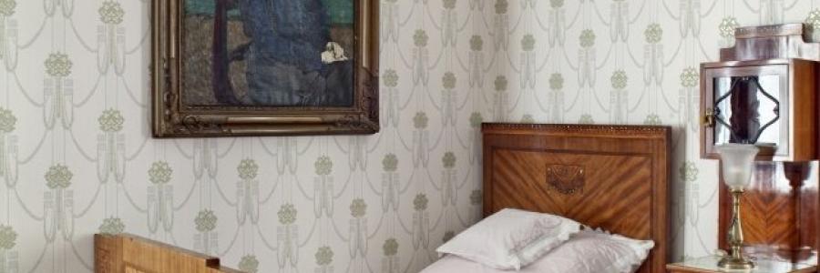 Wyposażenie pokoju gościnnego stanowi dziś secesyjny „garnitur” mebli do sypialni składający się z łóżek, szafy, szafek nocnych i umywalni wykonanych w łódzkiej fabryce mebli (XIX/XX w.). Na umywalni fajansowy komplet toaletowy i przybornik do golenia. Pod ścianą kanapa i fotele kryte oryginalną tkaniną ze wzorem liści kasztanowca. Obok szafy umieszczone zostały akcesoria podróżne: kufer, walizki i pudła na kapelusze. Na ścianach między innymi dzieła Jana Ciąglińskiego (1858-1913) Pianistka, Józefa Mehoffera (1869-1946) W parku.
