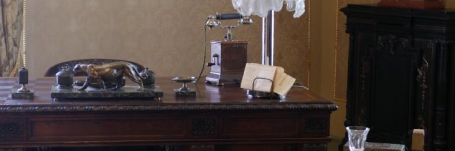 Wyposażenie gabinetu stanowią dziewiętnastowieczne meble: neobarokowe szafy biblioteczne, kryte skórą fotele klubowe oraz neorenesansowe biurko z fotelem. Pod oknem, na kolumnie marmurowe popiersie Karola Wilhelma Scheiblera – ojca Matyldy – wykonane ok. roku 1881 przez Alberta Rachnera (1846 – 1900). Na ścianach między innymi fotografie Edwarda i Matyldy Herbstów oraz jednego z ich synów, Leona, a także portret jego żony Aleksandry namalowany przez Fritza von Kamptza (1866-1938) oraz pochodzące z kolekcji jednego z łódzkich fabrykantów litografie Aleksandra Orłowskiego (1777-1832): Pałac Wielkiego Księcia Michała w Petersburgu oraz Wybrzeże Angielskie w Petersburgu. Na podłodze kobierzec wschodni (pocz. XX w.).
