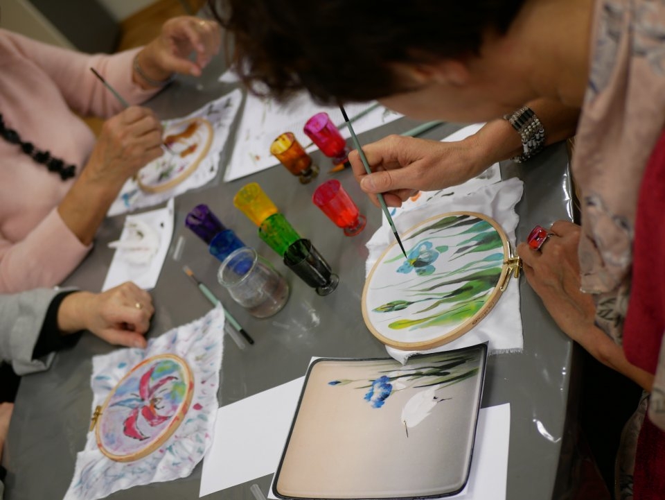 Trzy kobiety pochylające się nad obrazkami, które malują przy pomocy farb akwarelowych, na pracach widoczne kwiaty