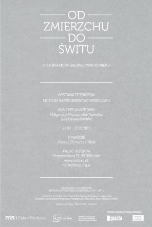 Od ekstrawaganckiej, rozmiłowanej w maskaradzie dworskiej kultury XVIII w. przez burzliwą epokę napoleońską, mieszczański biedermeier, eklektyczną drugą połowę XIX w. i wyrafinowaną Belle Epoque do pełnego sprzeczności dwudziestolecia międzywojennego aż po czasy współczesne. Wystawa ze zbiorów Muzeum Narodowego we Wrocławiu prezentowana w Pałacu Herbsta przedstawiała historię mody balowej poprzez autentyczne ubiory kobiece i męskie oraz akcesoria mody wieczorowej: eleganckie suknie i okrycia balowe, kreacje XX-wiecznych projektantów, kostiumy maskaradowe urzekające wielością inspiracji, pantofelki i mufki, orientalne i koronkowe szale, wachlarze i pelerynki z ptasich piór, kotyliony i karnety balowe, fantazyjne kapelusze i torebki, balowe rękawiczki i ekstrawagancką biżuterię. Odsłania skomplikowany proces przygotowania do wejścia na balową scenę i instrumenty uwodzenia: gorsety, krynoliny i turniury, które nadawały kobiecemu ciału pod balową suknią aktualnie modny kształt. Portrety dokumentują końcowy efekt, dowodząc, że dama en grande toilette to dzieło sztuki.